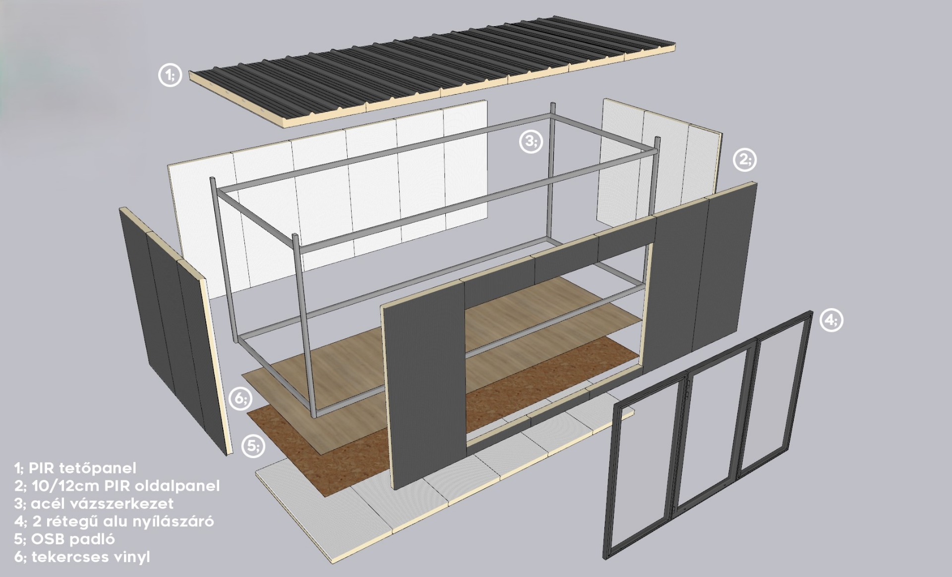 Homlokzat és tetőburkolat szendvicspanelből készül, mely két acéllemez közötti hőszigetelő PIR habmagból áll . Dekor elemek az épületen szabadon választhatóak úgy színben mint anyagban vagy elrendezésében - korcolt lemez , PVC burkolat , 3D falpanelek....Hőszigetelés vastagság: